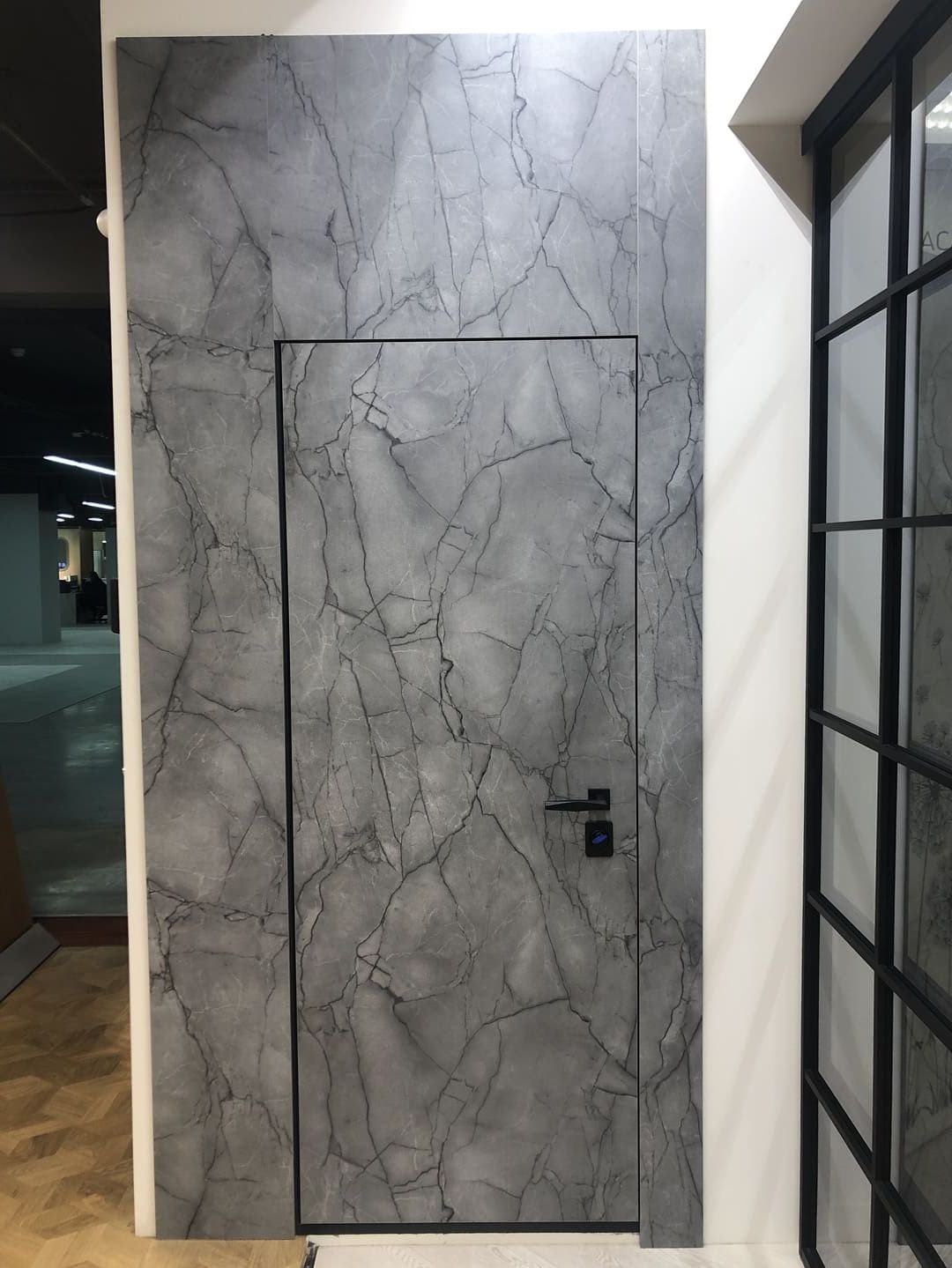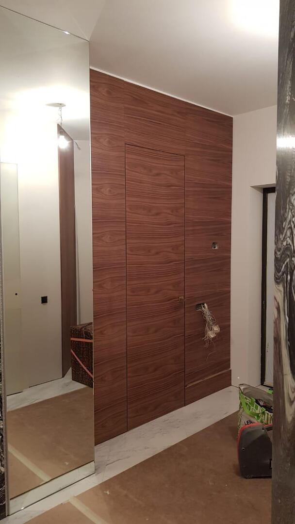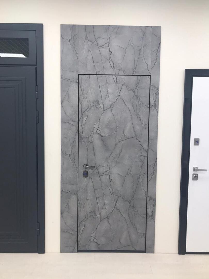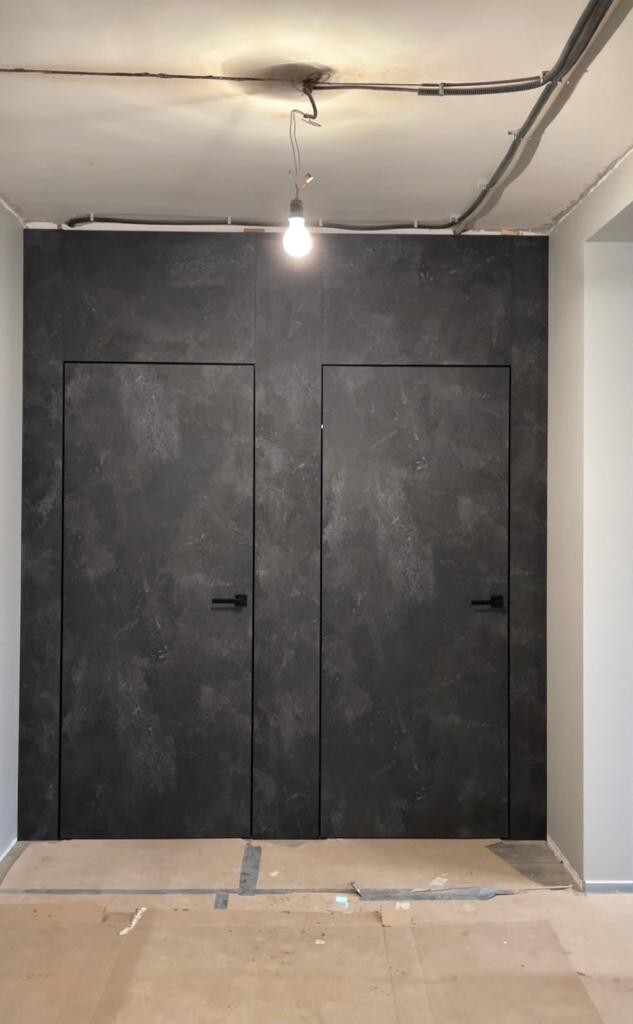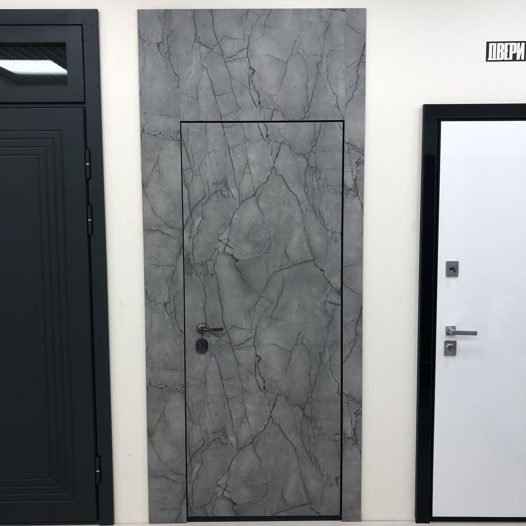 Современно и эстетично. Добавить графичности или сделать акцент именно на скрытой двери помогут современные отделки, например, шпонированные панели или оформление антивандальным материалом с имитацией природного камня. Бонус - возможность изменения облика в соответствии с новыми требованиями интерьера.