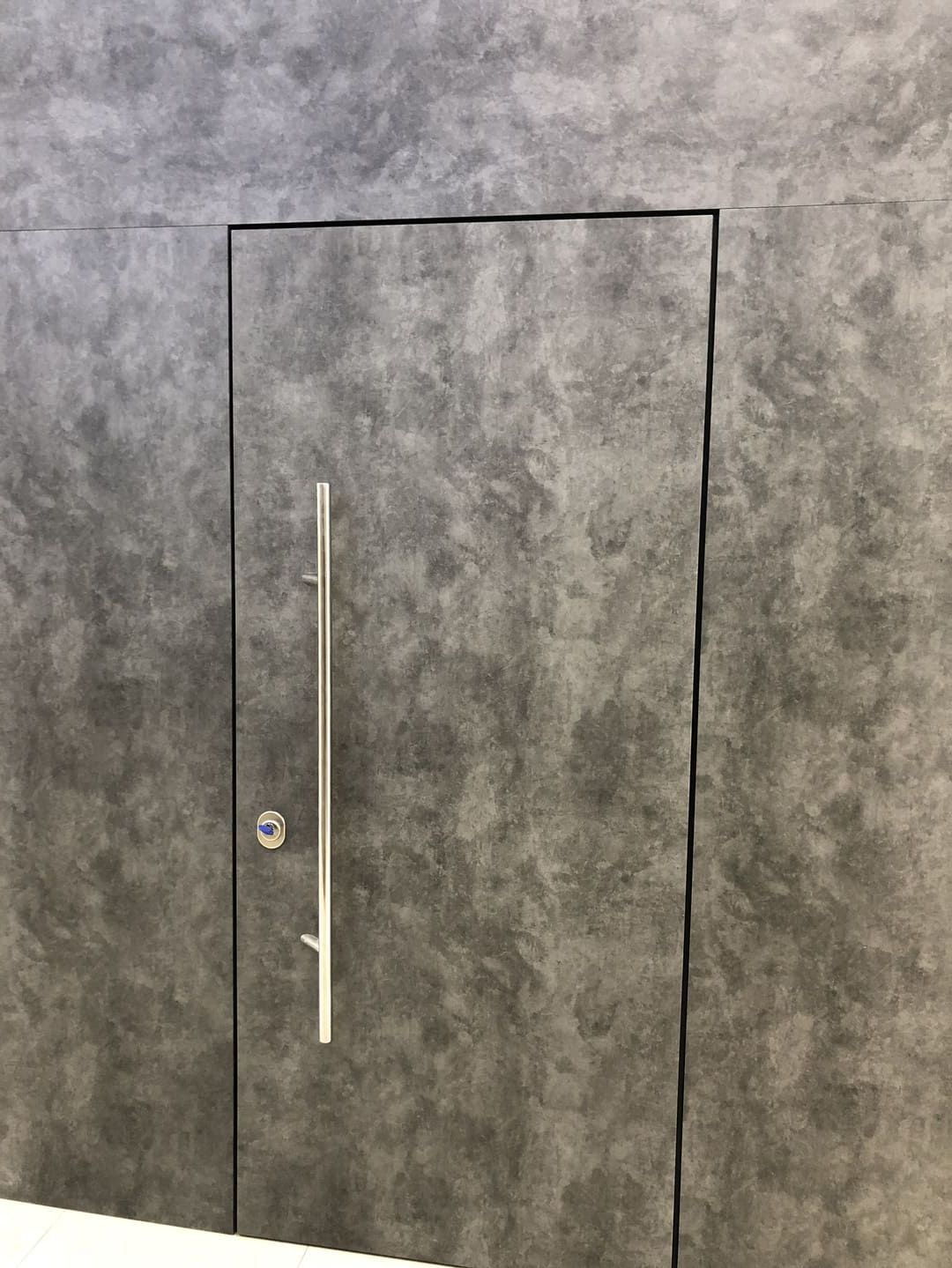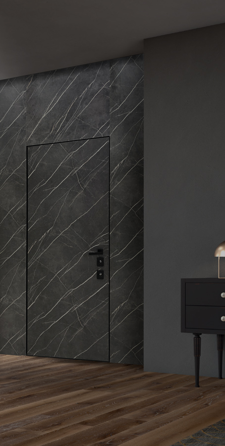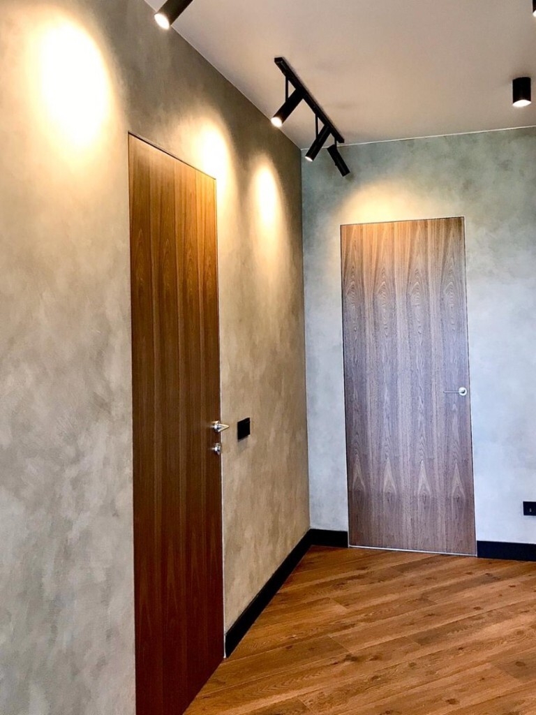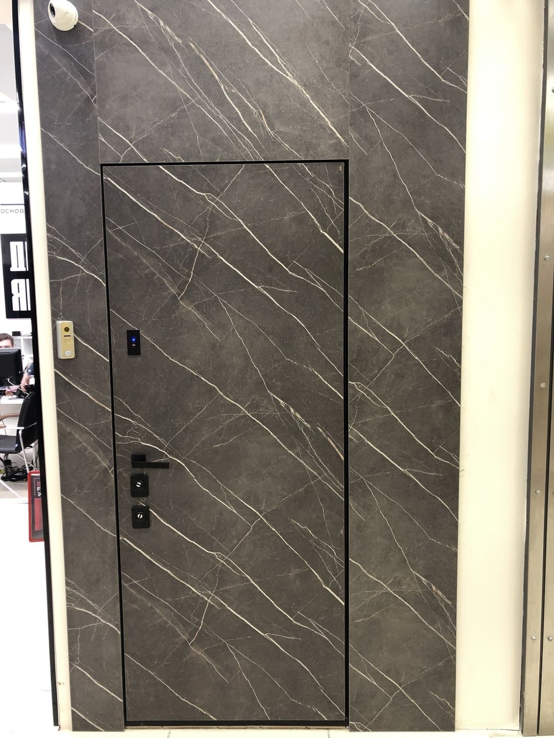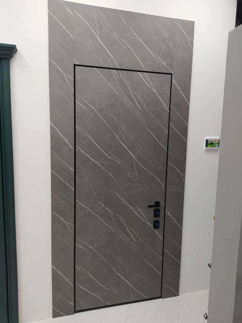 Современно и эстетично. Добавить графичности или сделать акцент именно на скрытой двери помогут современные отделки, например, шпонированные панели или оформление антивандальным материалом с имитацией природного камня. Бонус - возможность изменения облика в соответствии с новыми требованиями интерьера.