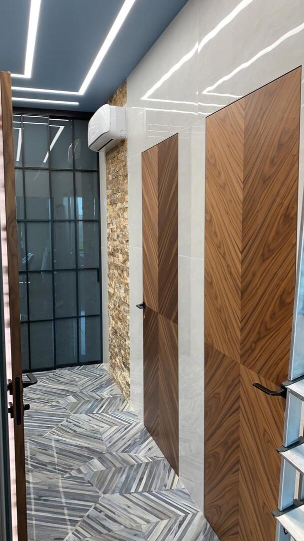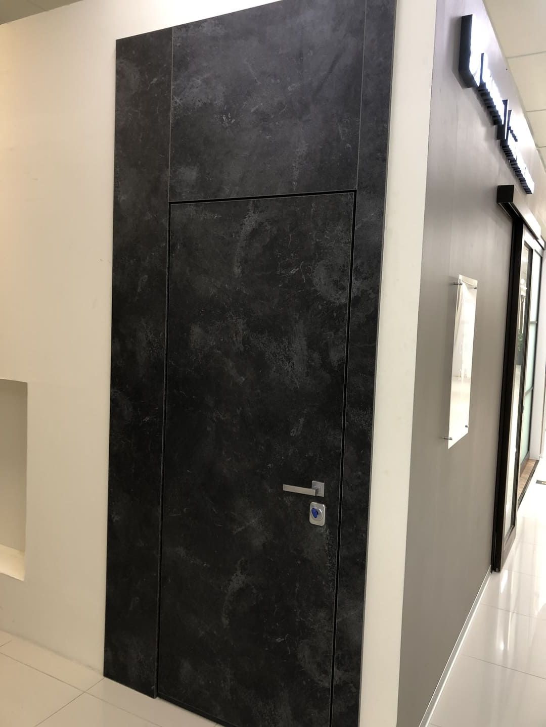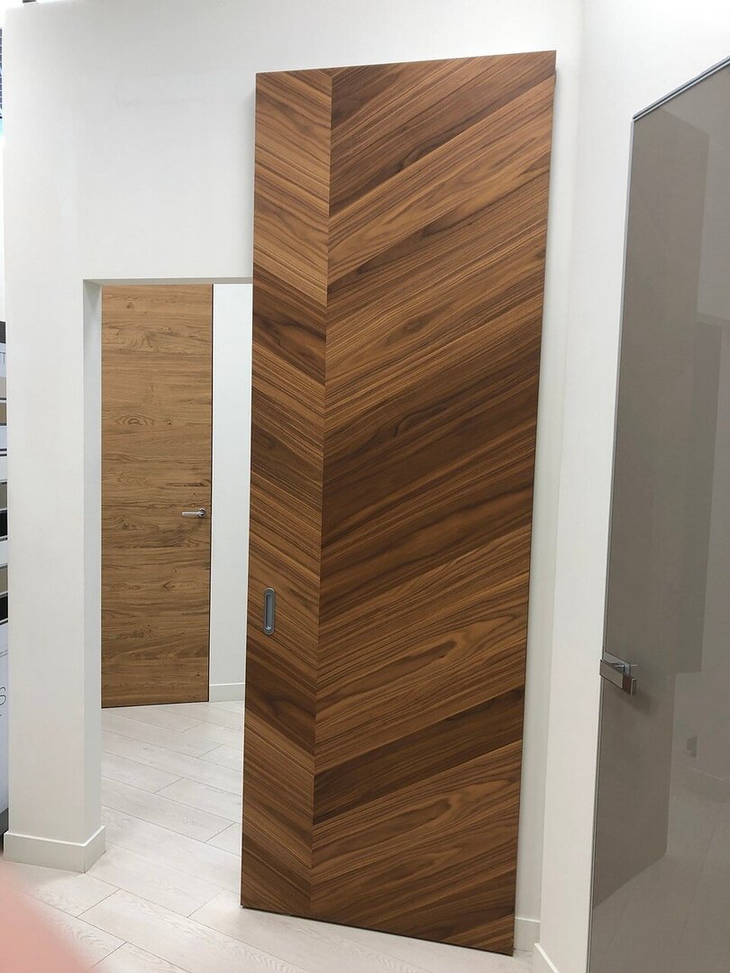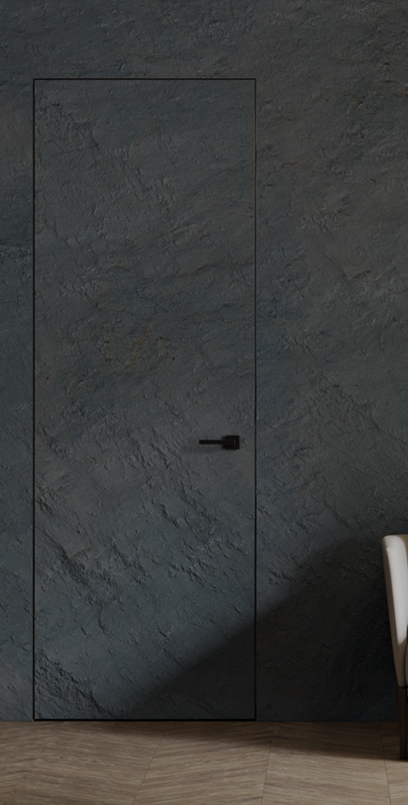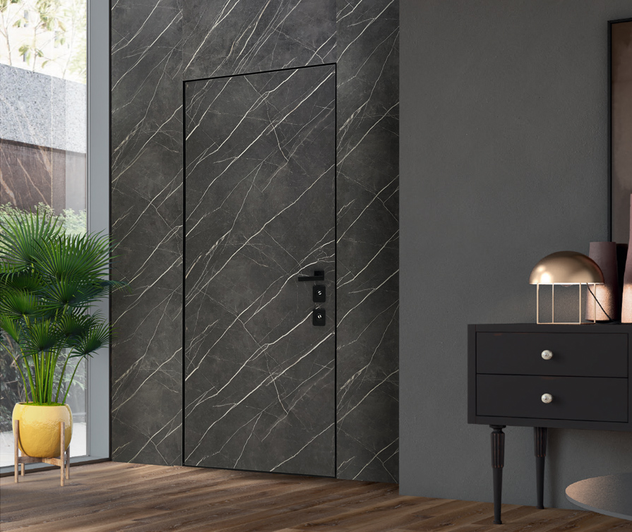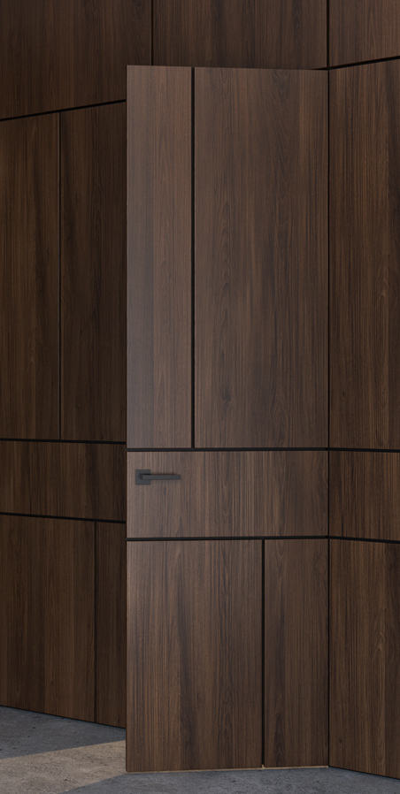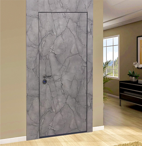 Современно и эстетично. Добавить графичности или сделать акцент именно на скрытой двери помогут современные отделки, например, шпонированные панели или оформление антивандальным материалом с имитацией природного камня. Бонус - возможность изменения облика в соответствии с новыми требованиями интерьера.
