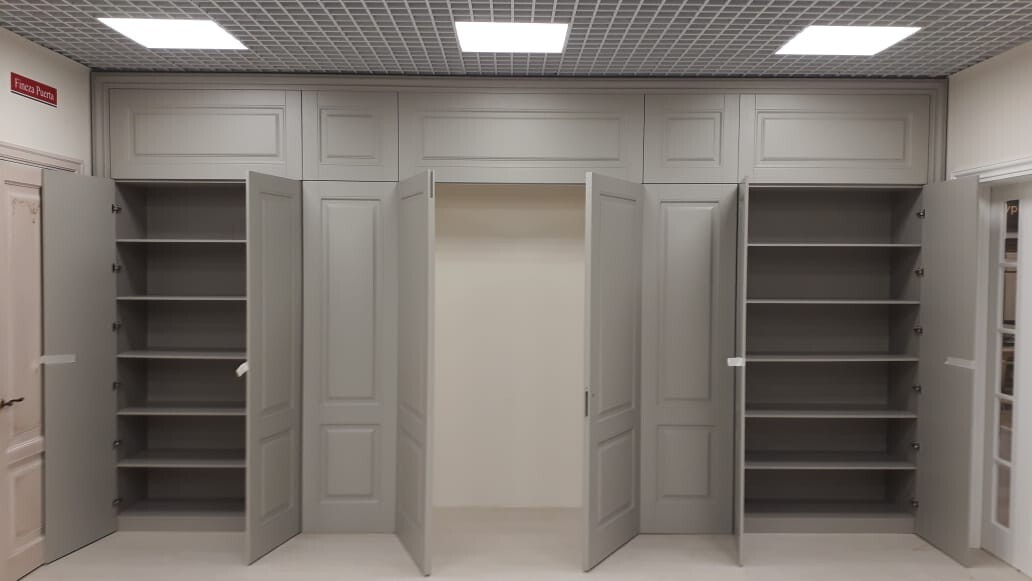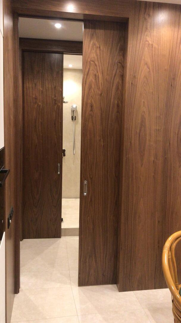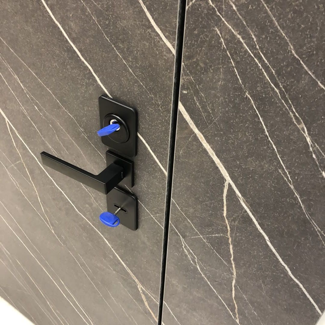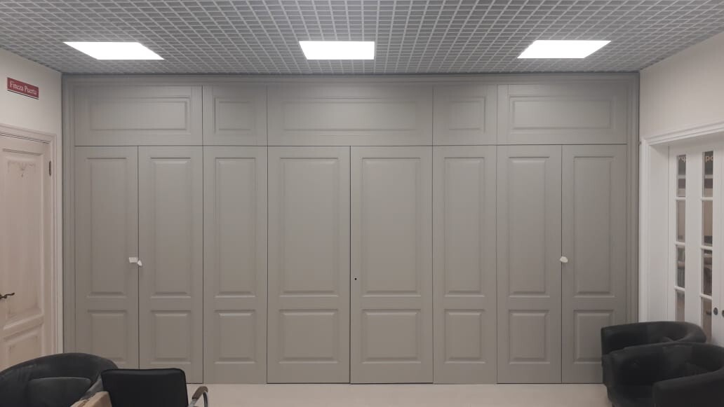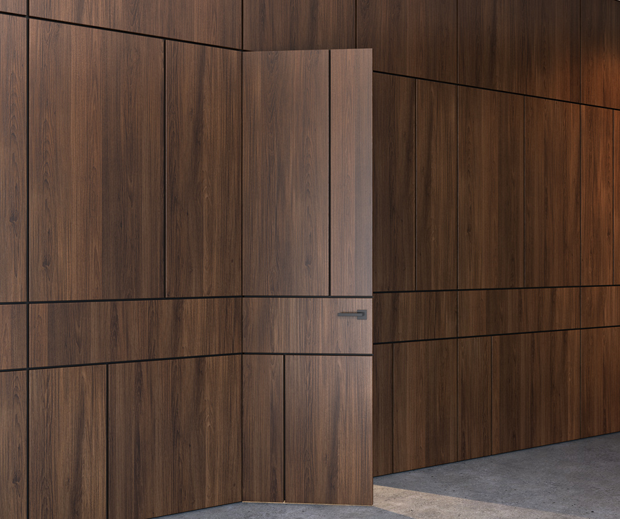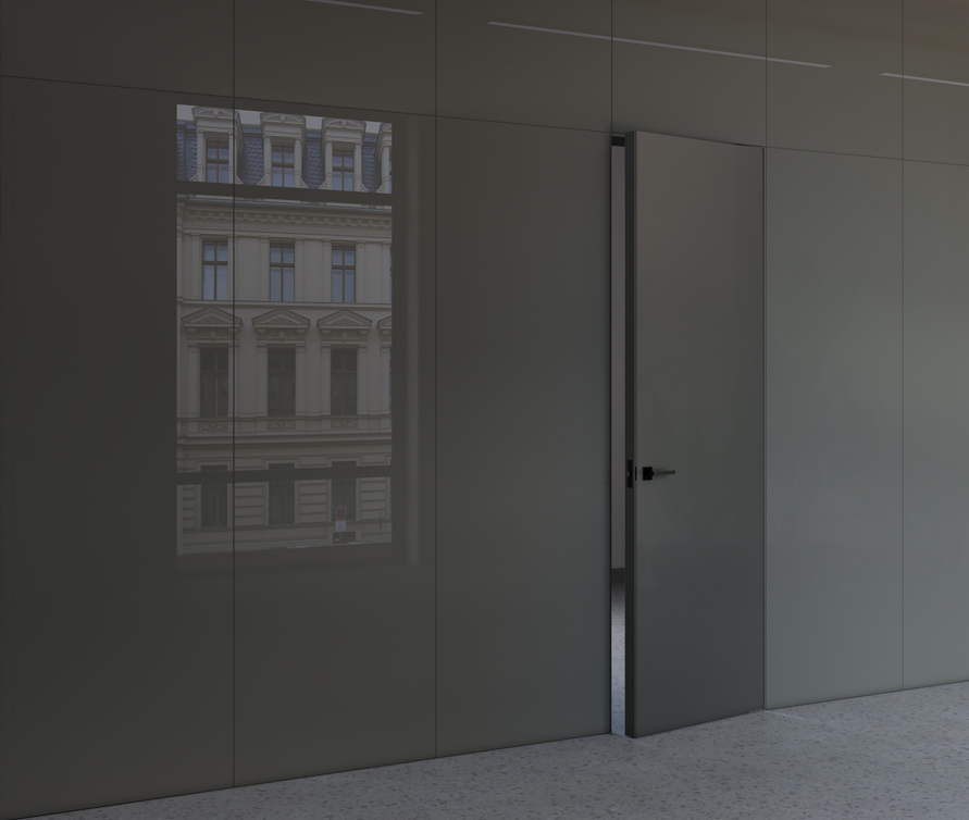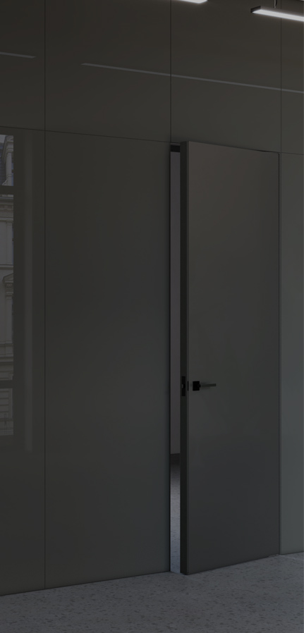 Двери комплектуются скрытыми, регулируемые в трех плоскостях и с открыванием до 180°(зависит от способа монтажа), петлями и бесшумными магнитными замками с пластиковым язычком итальянского производства. Доступны к заказу раздвижные двери и стеновые панели в цвет дверей.
